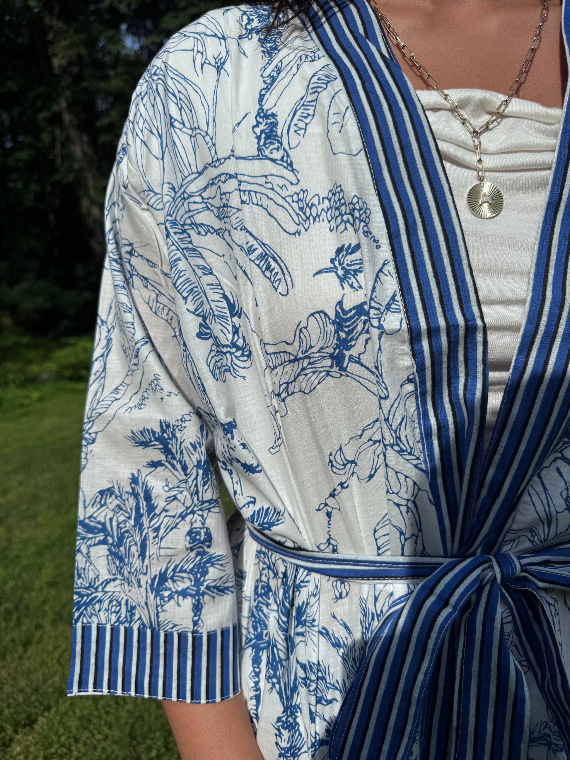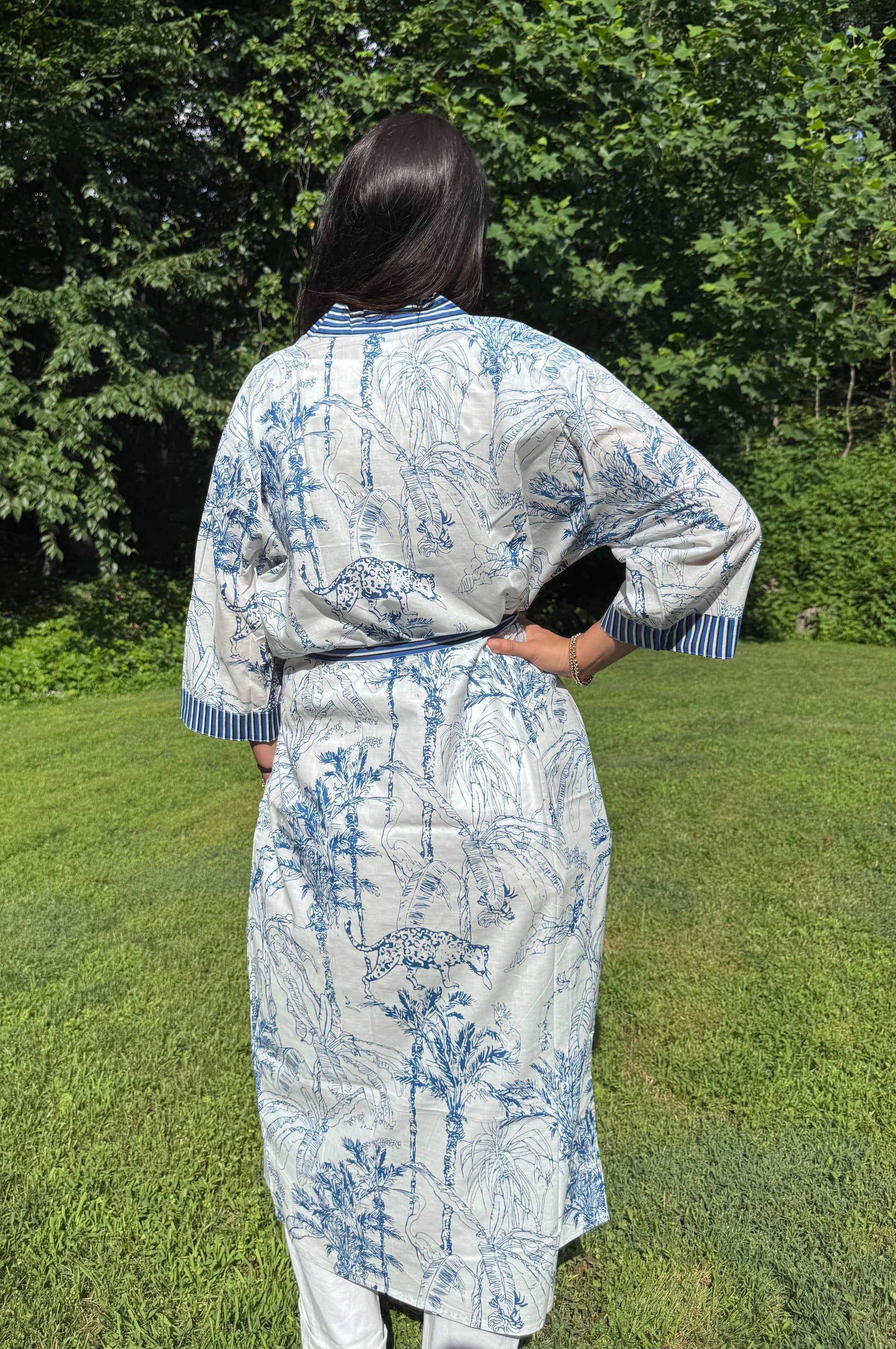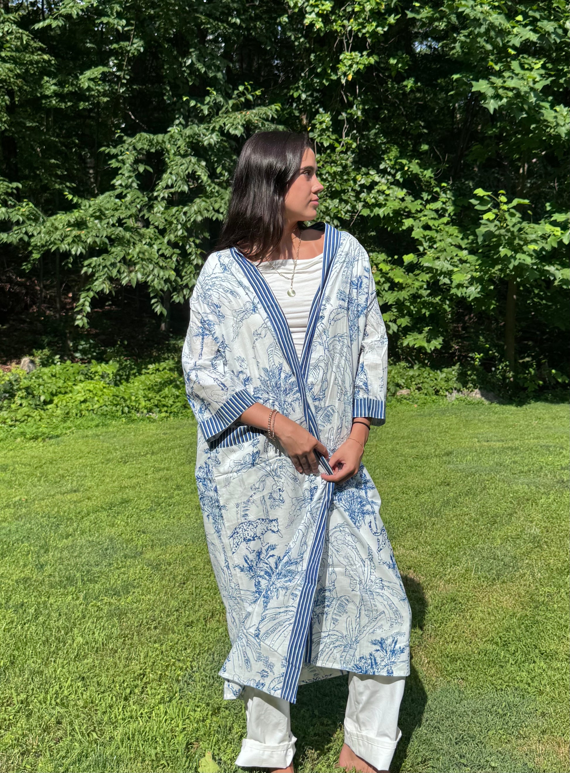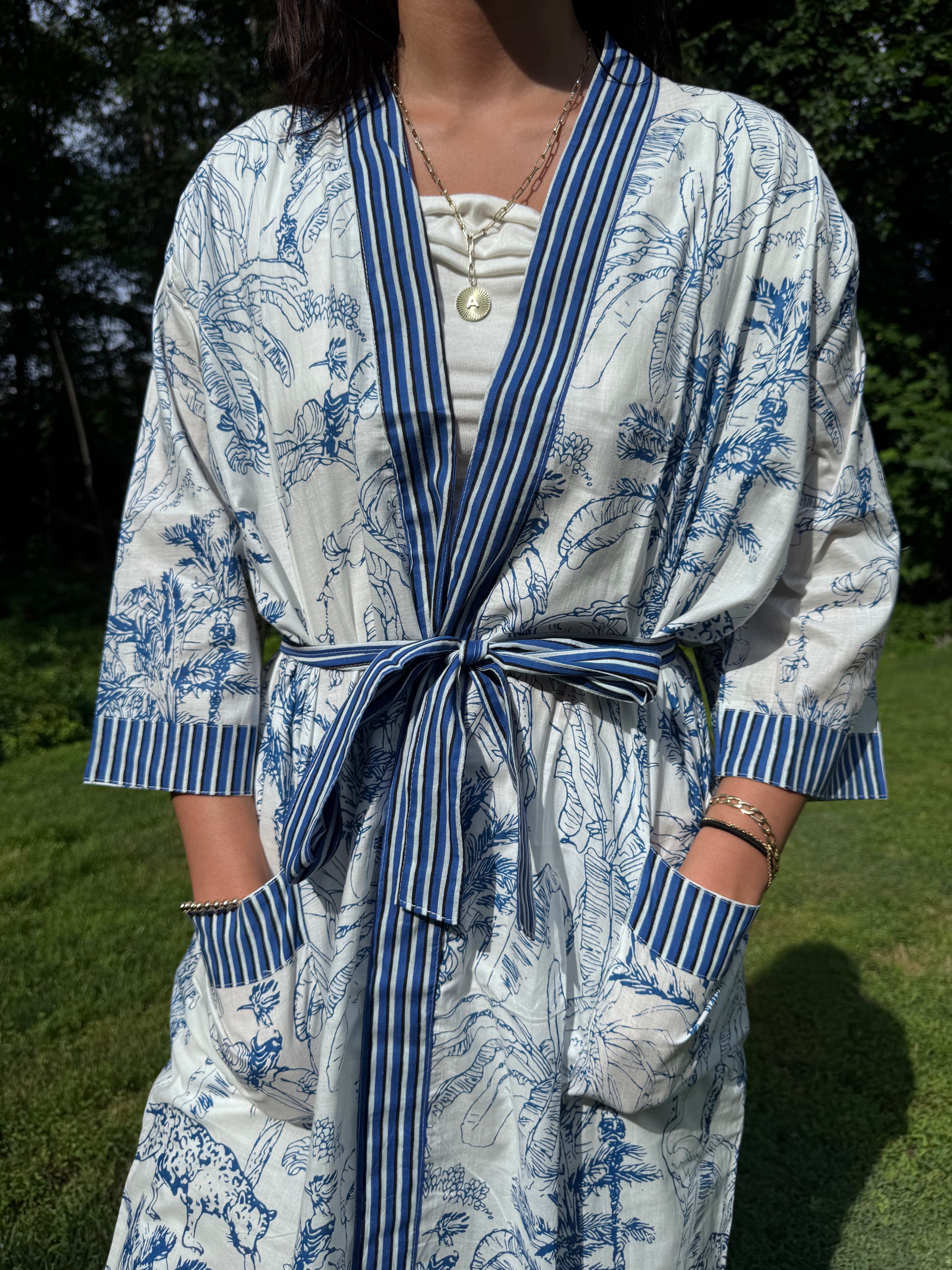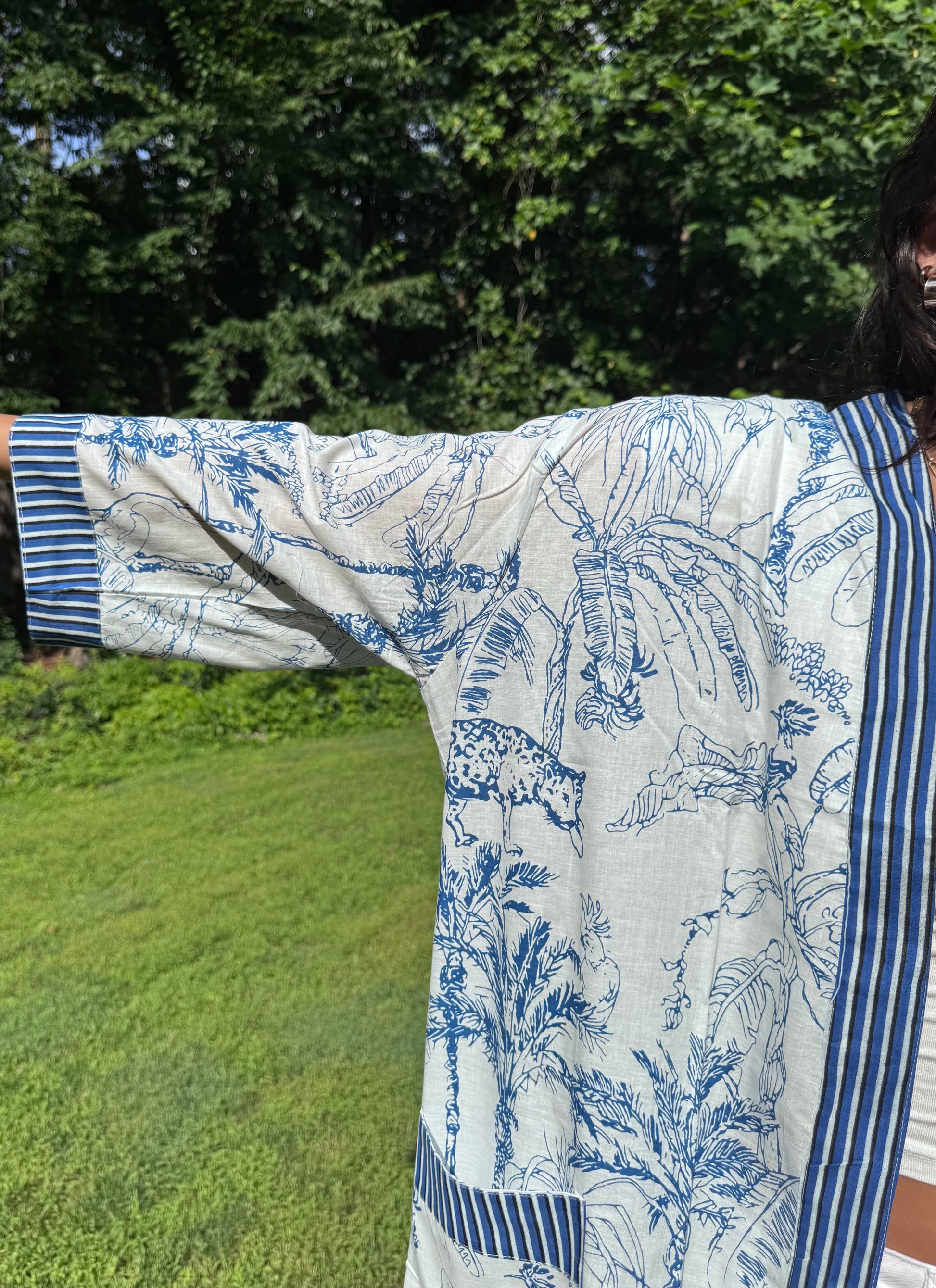 Our exquisite hand-block printed cotton kimono robe is the ultimate piece for all your lounging needs. Made from high-quality cotton, this versatile garment can be used as a dressing gown, beach cover-up, or even lounge wear.