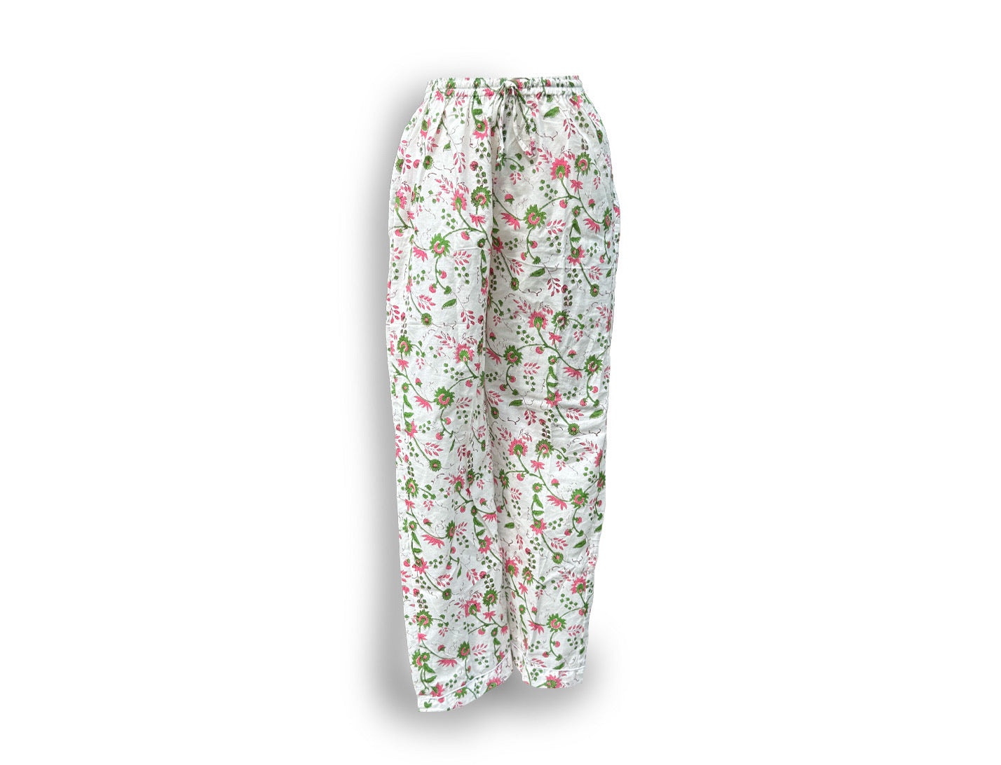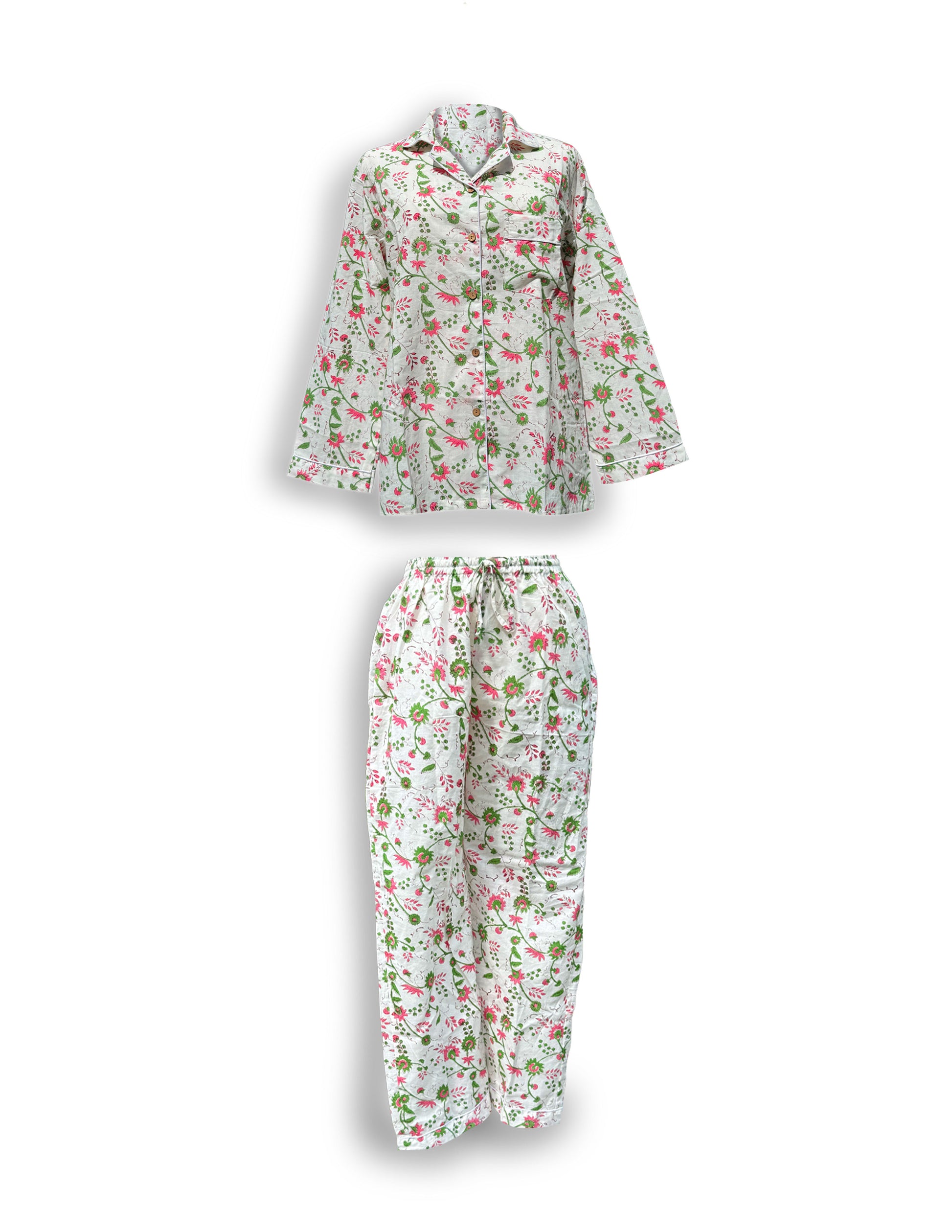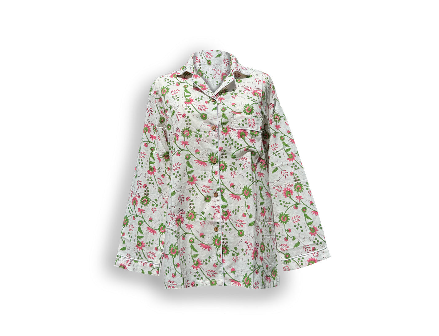 Indulge in comfort and style with our "Block Print Women's Pajama Set." This exquisite set features a long-sleeve button-down top and matching pants, two front pockets, complete with a convenient drawstring waist for an adjustable fit. Crafted from soft, breathable cotton, the intricate block print design adds a touch of elegance, making it perfect for lounging at home or a cozy night's sleep!