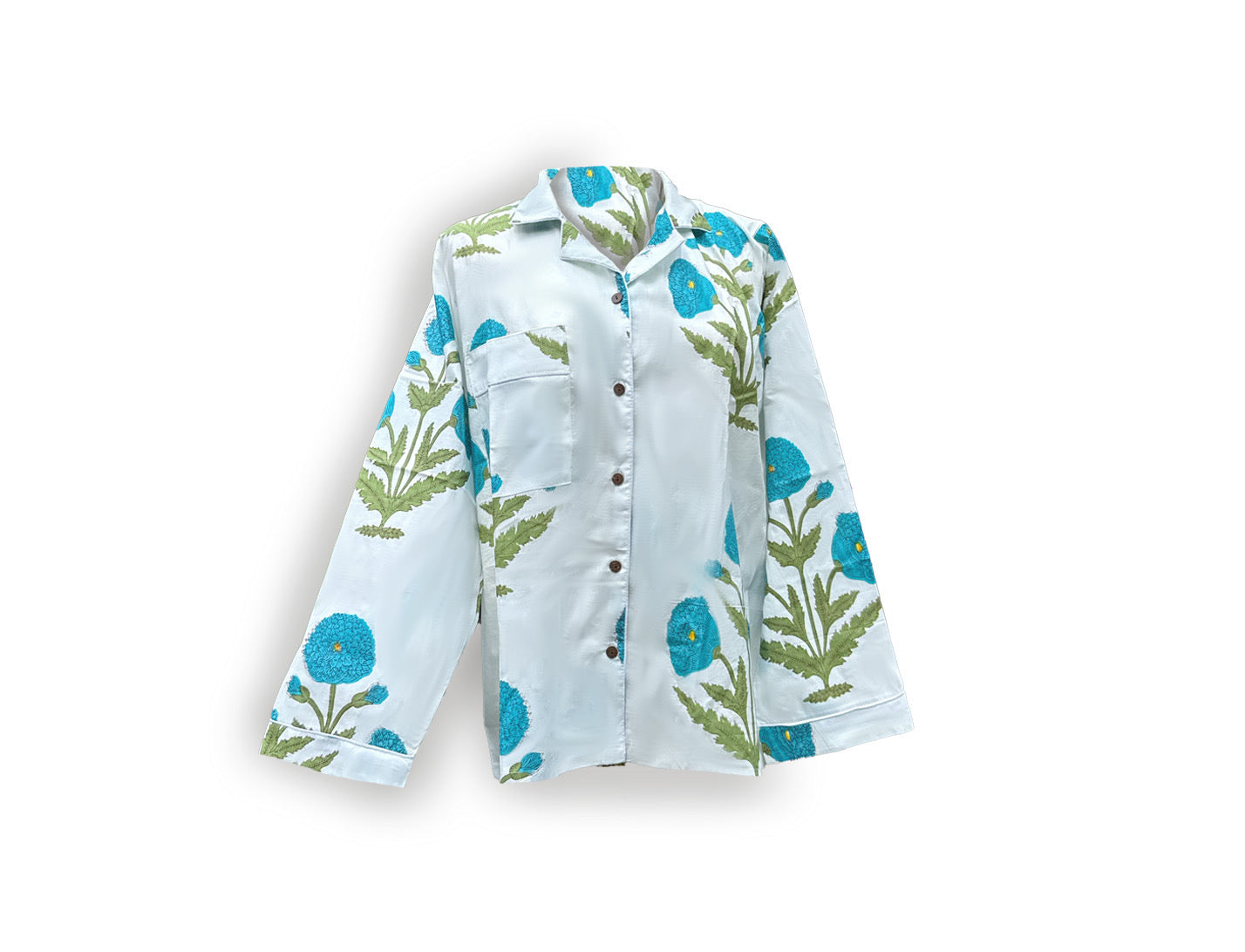 Indulge in comfort and style with our "Block Print Women's Pajama Set." This exquisite set features a long-sleeve button-down top and matching pants, two front pockets, complete with a convenient drawstring waist for an adjustable fit. Crafted from soft, breathable cotton, the intricate block print design adds a touch of elegance, making it perfect for lounging at home or a cozy night's sleep!